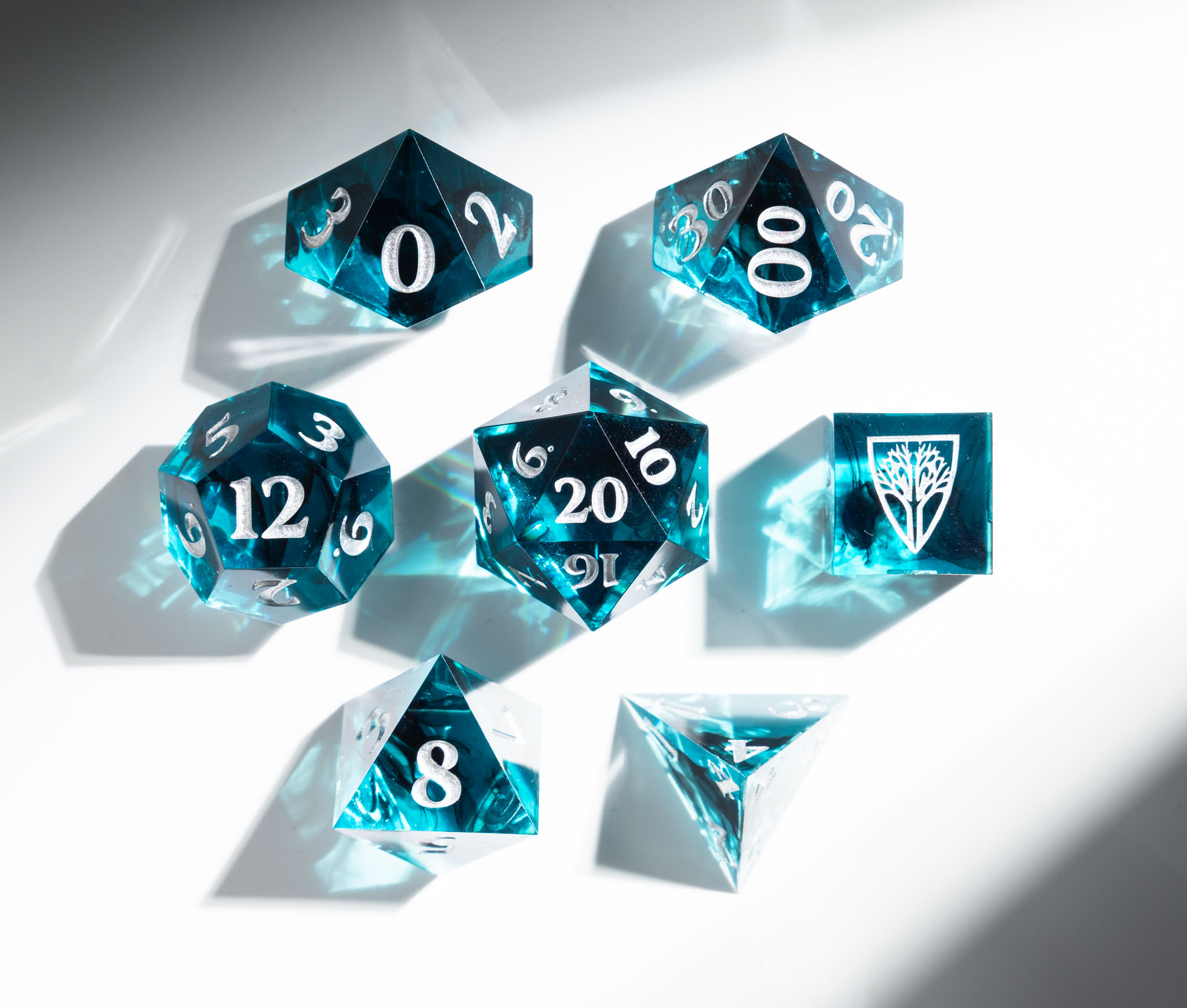 Dice are available in sets of seven standard polyhedrals. Each D6 features the Wyrmwood Shield in place of the six.